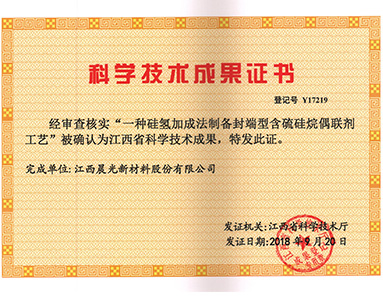 "A process for preparing end-sealed sulfur-containing silane coupling agent by silohydroaddition method" was awarded the honor of "Scientific and Technological Achievements of Jiangxi Province" by Jiangxi Provincial Science and Technology Department.