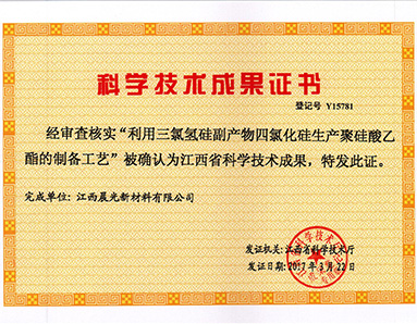 "The preparation process of polysilicate ethyl ester using silicon tetrachloride as a by-product of trichlorohydrosilicane" was awarded the honor of "Scientific and Technological Achievements of Jiangxi Province" by Jiangxi Provincial Science and Technology Department.
