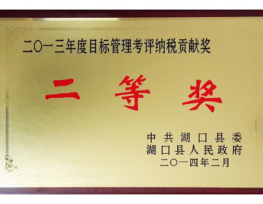 Hukou County Party Committee and Hukou County People's Government jointly awarded the Second Prize of "2013 Target Management Evaluation Tax Contribution Award".
